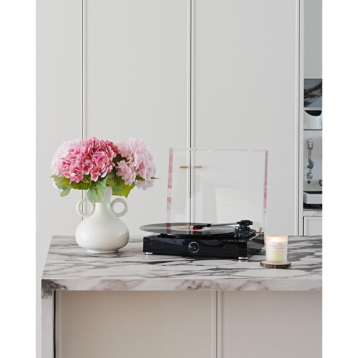 This record player features a clean, modern design that blends classic style with everyday functionality. The sleek white finish and dust cover add a decorative touch while fitting easily into bedrooms, living rooms, or home offices. Designed with a 3-speed belt-drive system, it supports multiple playback speeds and disc sizes for flexible listening. Built-in Bluetooth connectivity allows you to stream music from compatible devices or play audio through external Bluetooth speakers. With custom-tuned stereo speakers built in, this record player offers an all-in-one listening solution with no additional equipment required. Both functional and stylish, it serves as a music player and a home decor accent.