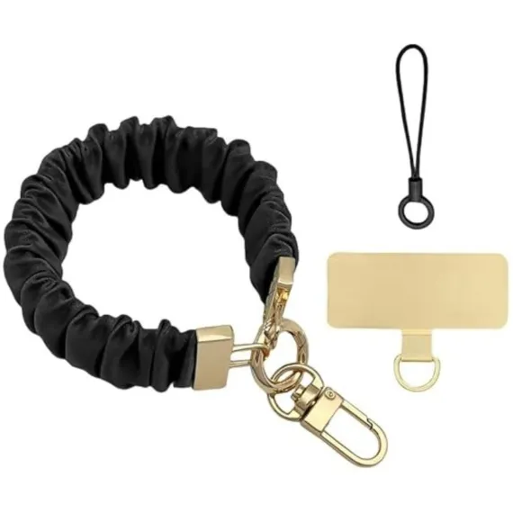 This adjustable 4-8 inch elastic phone wrist strap, made with high-stretch elastic and textured satin, ensures anti-slip grip during workouts/travel/commutes, features scratch-resistant gold alloy clasps for security, soft breathable fabric for all-day comfort, comes in 3 colors (Black/Burgundy/Ivory), includes key rings/carabiner/tool for multi-use (phones/keys/tablets up to 7.2 inches), and withstands 10,000+ stretches at 1.1oz for durable hands-free use.
