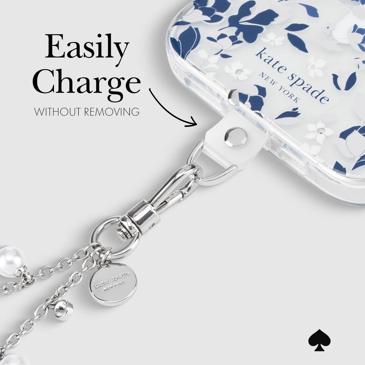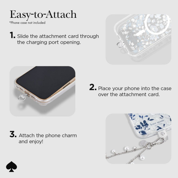 The Kate Spade New York phone charm is the perfect accessory for those with an active, on-the-go lifestyle, combining both practicality and timeless style. This chic wristlet is designed to fit all phone cases, allowing you to charge your device without removing it, keeping your hands free. Featuring the signature Kate Spade New York design, it adds a touch of elegance to your essentials. Whether you're running errands or heading out for a night, this stylish wristlet ensures you stay connected while making a fashionable statement, offering both convenience and sophistication wherever you go.
