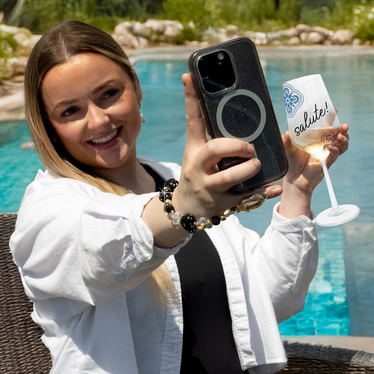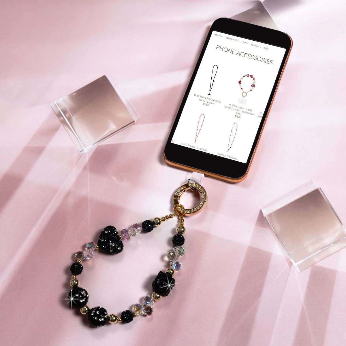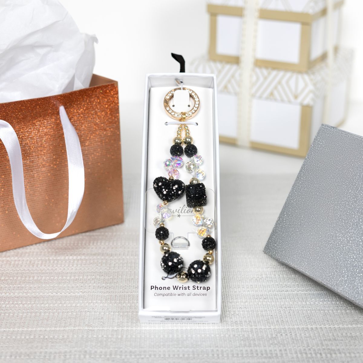 The Black Crystal Wristlet is designed to blend glamour and convenience seamlessly. Its beaded design, with alternating black and iridescent crystal-like beads, makes it a standout accessory that doubles as a practical phone holder. The gold metal clasp is gemmed for extra sparkle, while the clear acrylic tab ensures easy phone attachment. Whether you’re out running errands or attending an elegant event, this wristlet keeps your phone within reach and your hands free. It’s more than an accessory—it’s a style statement with functionality.