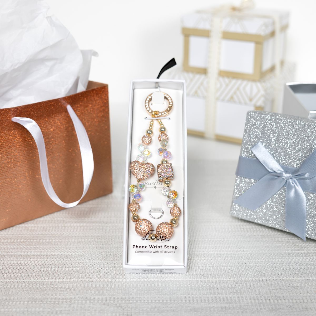 Pavilion Gift Company - Champagne Crystal Wristlet - Beaded Hands-Free Gold Wrist Strap - Cell Phone Accessories