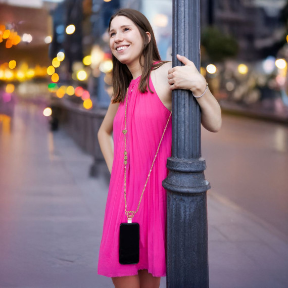 The Gold Crystal Crossbody Phone Chain is a luxurious and stylish solution for hands-free convenience. Designed with a 56-inch gold-tone beaded chain, this accessory is adorned with gold crystal accents, enhancing both elegance and durability. The gemmed metal clasp securely holds a clear acrylic phone holder tab, making it compatible with most phone cases. Its sleek and modern gold-tone aesthetic makes it an ideal addition to any wardrobe, perfect for daily wear, travel, or special events. The branded acrylic tab ensures a secure and easy attachment, making installation hassle-free. A great gift for fashion enthusiasts, professionals, and those who love chic accessories, this lanyard is perfect for birthdays, holidays, or as a thoughtful surprise. Maintenance is simple—wipe with a soft cloth to keep it looking pristine, and avoid prolonged exposure to moisture or harsh chemicals. Packaged in a custom hanging gift box, this stylish crossbody phone chain is ready for gifting, offering both fashion and functionality in one elegant design.
