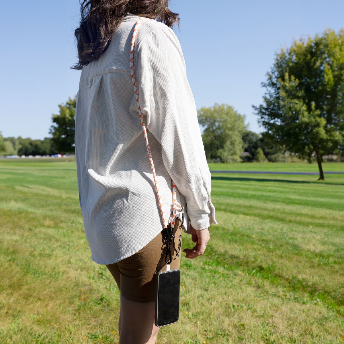 - PREMIUM QUALITY: This vibrant orange-striped nylon crossbody phone lanyard combines durability with eye-catching style. The 59" adjustable strap ensures a comfortable fit for all-day wear, while the strong metal accents provide additional durability. The branded phone tab allows for easy installation, making it a practical and reliable hands-free solution for keeping your phone close by while adding a pop of color to your outfit.