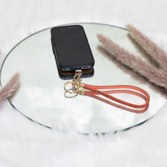 - IN-HOUSE DESIGN: Bright orange gemmed beads give this wristlet a bold and lively look, perfect for making a statement. The vibrant orange color is fun and eye-catching, making it a great accessory for anyone who loves standing out. The Pavilion-branded phone tab ensures secure attachment and ease of use, making this wristlet both fashionable and highly functional.