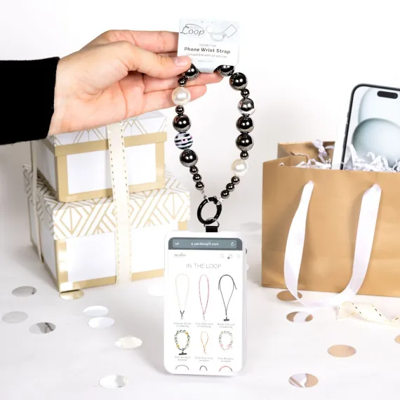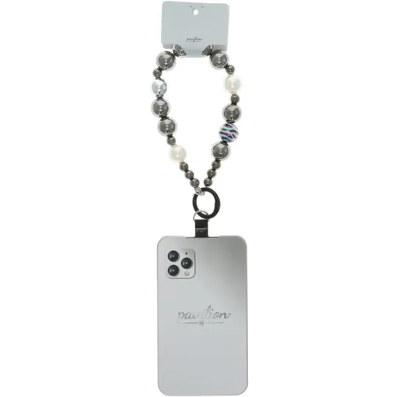- IN-HOUSE DESIGN: Features sleek silver beads with black and brown striped details, providing a modern and minimalist look. Easily attaches to any phone with the Pavilion-branded tab.