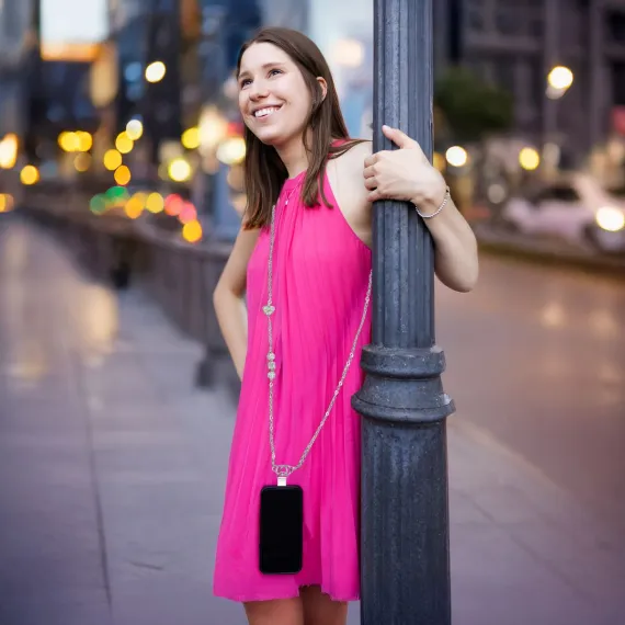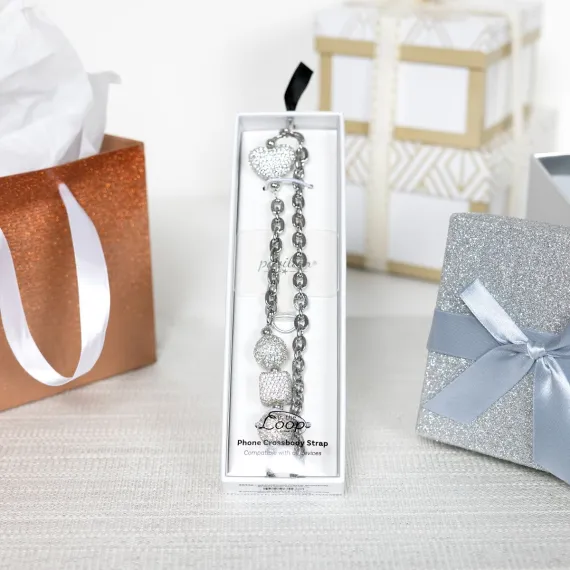 The Silver Crystal Crossbody Phone Chain is a timeless and versatile accessory, offering both practicality and style. Designed with a 56-inch silver-tone beaded chain, this elegant lanyard features shimmering silver crystal accents, adding a polished, sophisticated look. The gemmed metal clasp securely connects to a clear acrylic phone holder tab, ensuring it works with most phone cases. This sleek silver-tone chain is perfect for everyday use, whether for work, events, or casual outings, keeping your phone accessible while adding a stylish touch. The branded acrylic phone tab allows for easy and secure attachment, ensuring peace of mind wherever you go. A perfect gift for professionals, trendsetters, and those who appreciate refined accessories, this lanyard is a great choice for birthdays, holidays, or any special occasion. Maintenance is simple—just wipe clean with a soft cloth, and avoid moisture and harsh chemicals to preserve the silver finish. Packaged in a custom hanging gift box, this lanyard is ready for gifting, combining elegance and everyday functionality into a must-have fashion accessory.