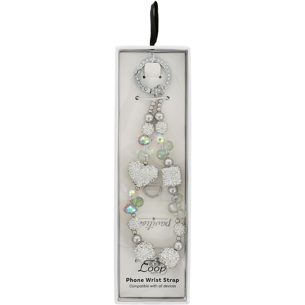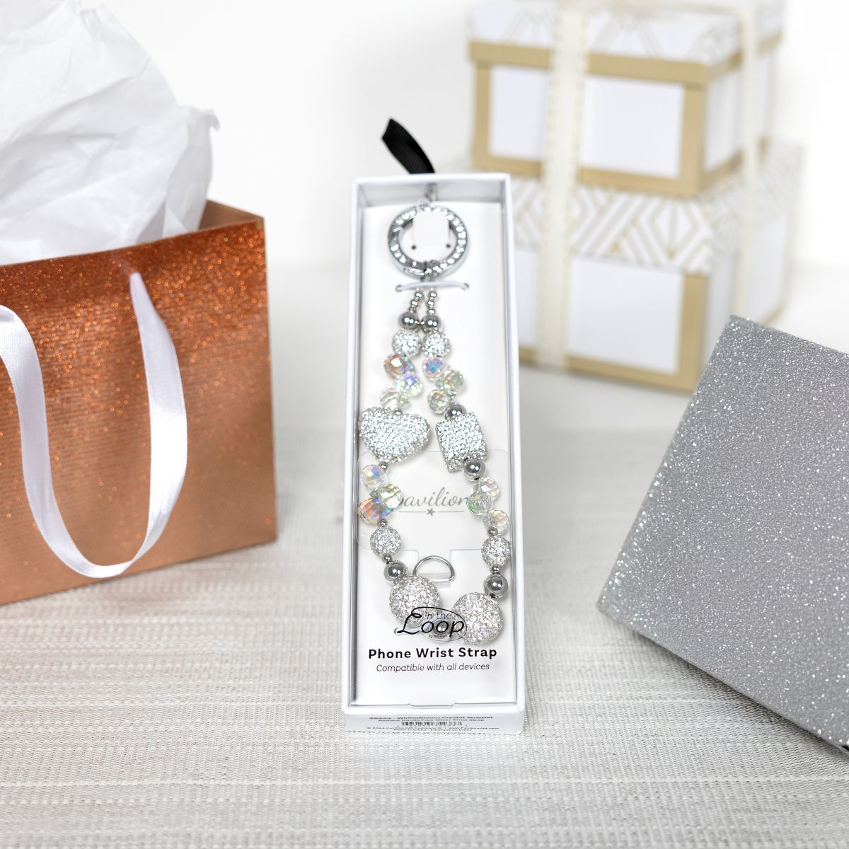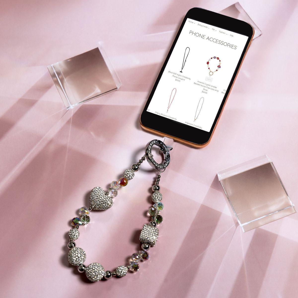 The Silver Crystal Wristlet is a versatile and stylish phone accessory, featuring sophisticated silver beads and a clear phone holder tab. The silver-plated gemmed clasp ensures secure attachment while adding a touch of luxury. Whether attending a meeting, party, or running errands, this wristlet complements any outfit and keeps your phone easily accessible.