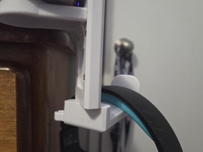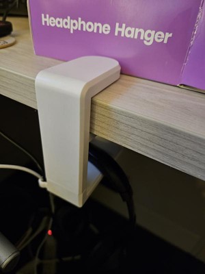 Adjustable headphone hanger to attach to your desk. The attachment is pressure mount (no tools needed) and can fit many different desk thicknesses. The part it hangs on can swing to several different angles. It is wide enough to support many different headphone sizes. Great option to keep those headphones out of the way.