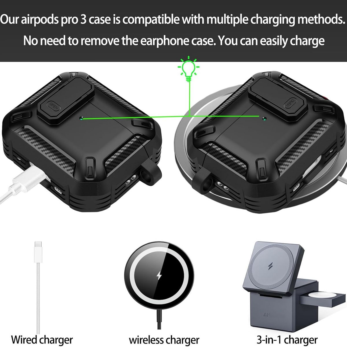 HTUTWOO AirPods Pro 3 Case, Full Drop Protector Cover with Carabiner and Cleaning Kit for Men Women (Black)