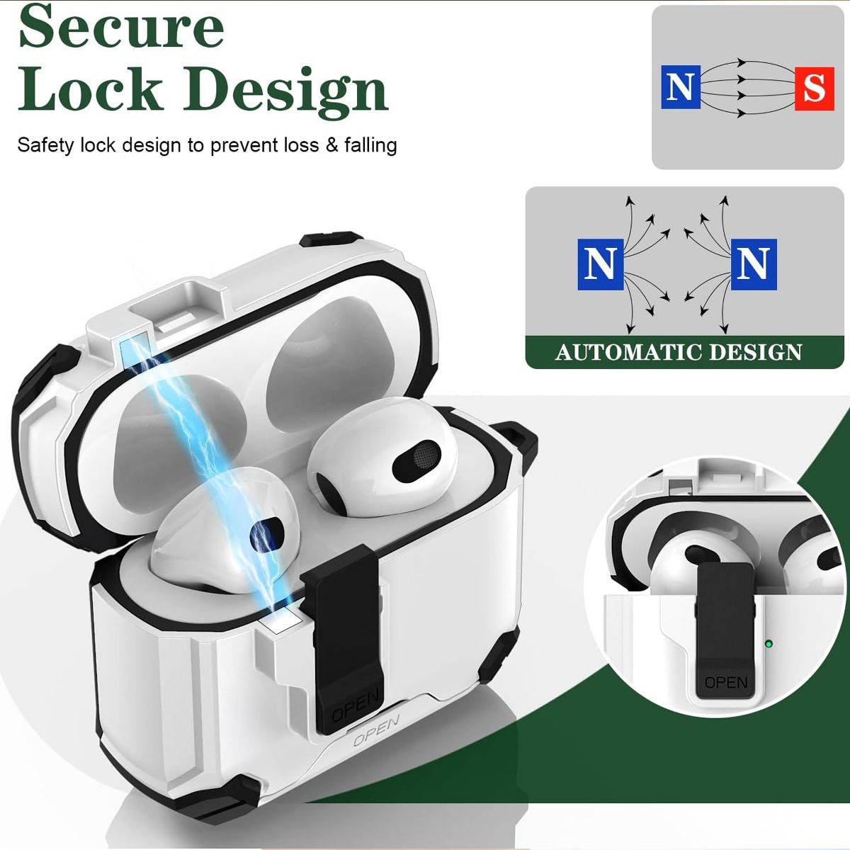 HTUTWOO Airpods pro 3 Case, Shockproof Full Body Cover, Support Wireless Charging with Secure Lock Design, Convenient Bracket (White)