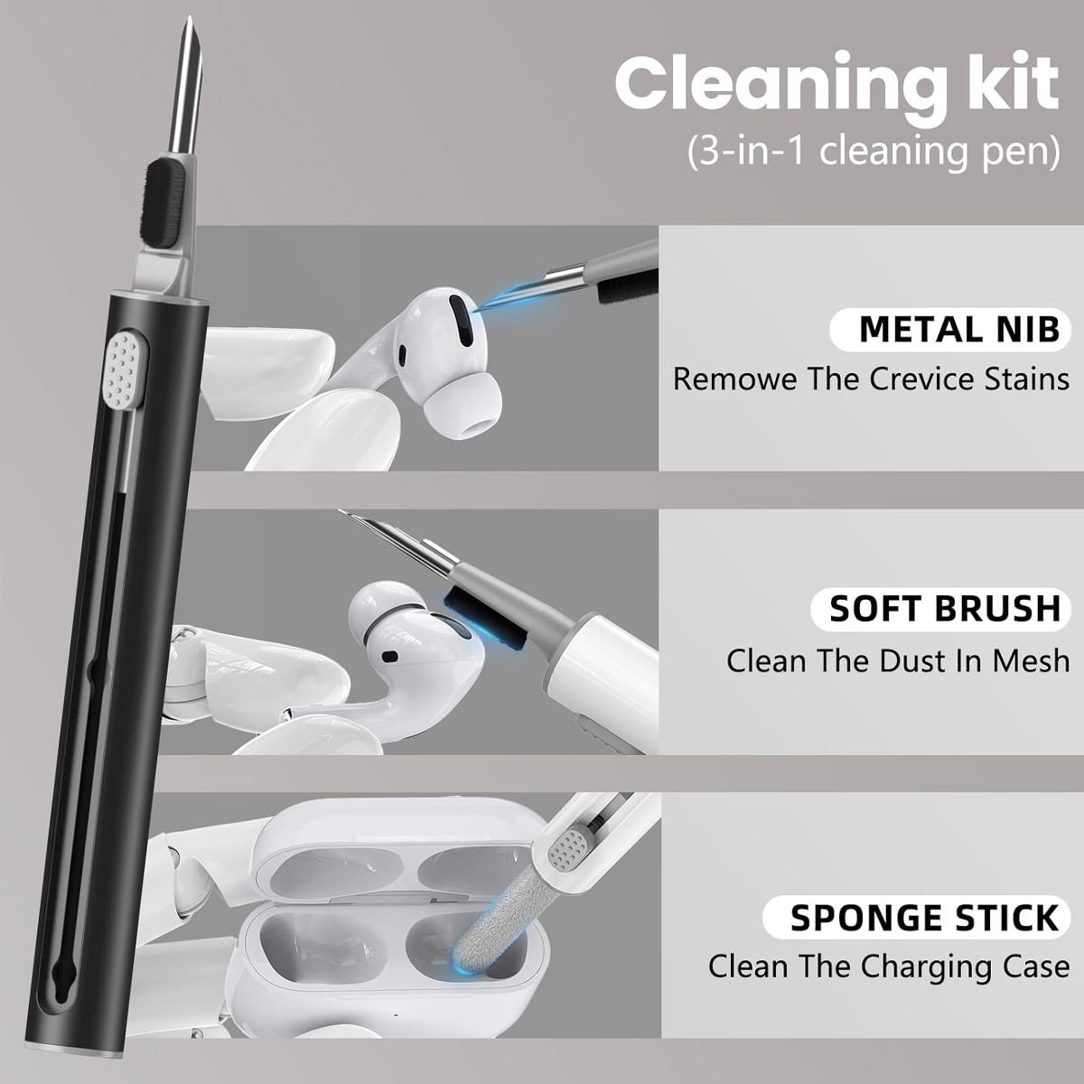 Multi-function Cleaing Kit :Our AirPods Pro 2 cleaning kit has made of high-quality and soft materials,with a separate double-head and a hidden design,for deep cleaning of crevices and stubborn dirt and won't damage the earplug components or holes to meet a variety of cleaning needs.