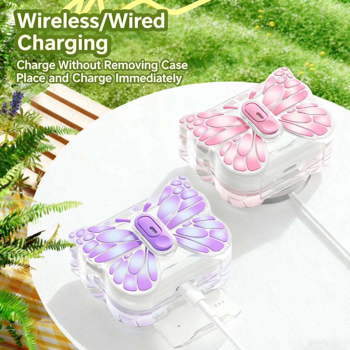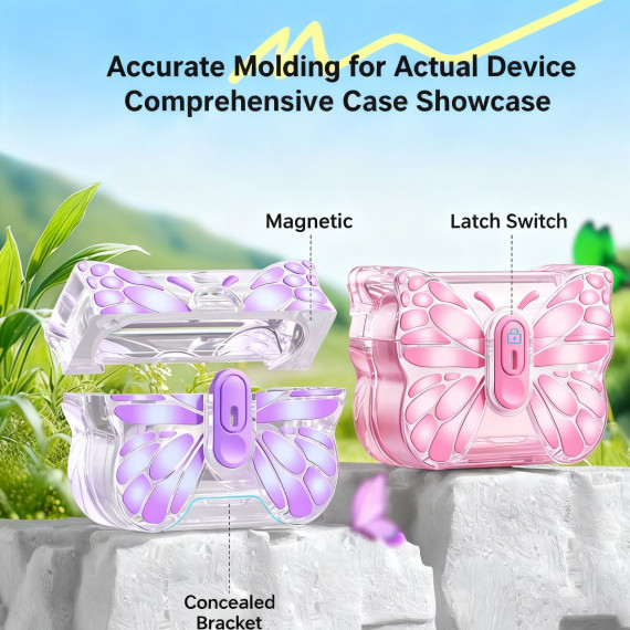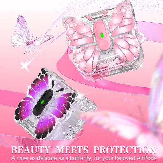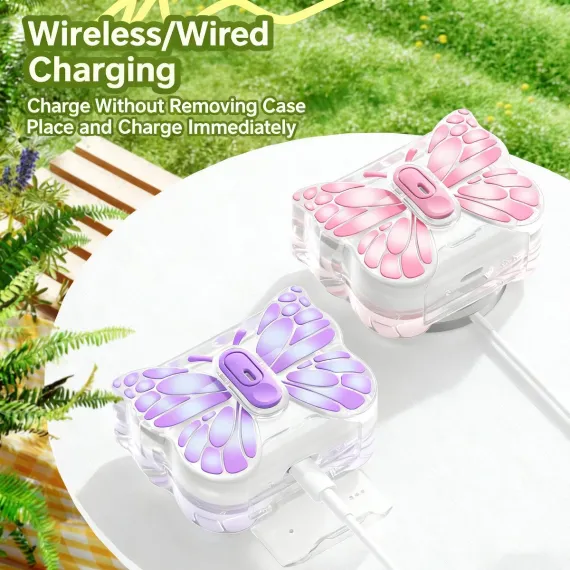 This case is exclusively designed for AirPods Pro 3, blending stylish aesthetics with practical functionality—featuring a transparent body adorned with a delicate butterfly pattern, anti-fall protection, an auto pop-up lid, a built-in kickstand, and a complementary cleaning kit. Unlike generic AirPods cases that sacrifice style for durability or lack user-friendly features, this cover solves four key pain points for AirPods Pro 3 owners: its transparent design showcases the original look of the earphone case while the butterfly pattern adds a subtle, elegant touch; the anti-fall structure absorbs impact from accidental drops, preventing scratches or cracks on the AirPods Pro 3 case; the auto pop-up lid opens smoothly and stays in place when needed, eliminating the hassle of stiff or loose lids that are hard to open; and the built-in kickstand lets you prop the case upright on desks or tables—convenient for checking battery status at a glance or keeping the case organized.