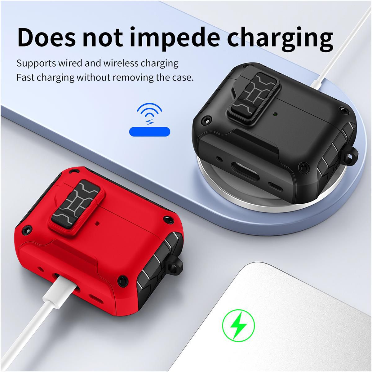 LIKE POLES REPEL: Magnets are also incorporated within the lid. Press the bottom button on the latch and your lid will spring open (as a result of same magnetic polarity). Such cool and useful technology that is convenient (and very satisfying to press). When you close the lid, you'll hear and feel the latch "click" secure. Enjoy peace of mind, knowing your Airpods Pro 3 are secure shut.
