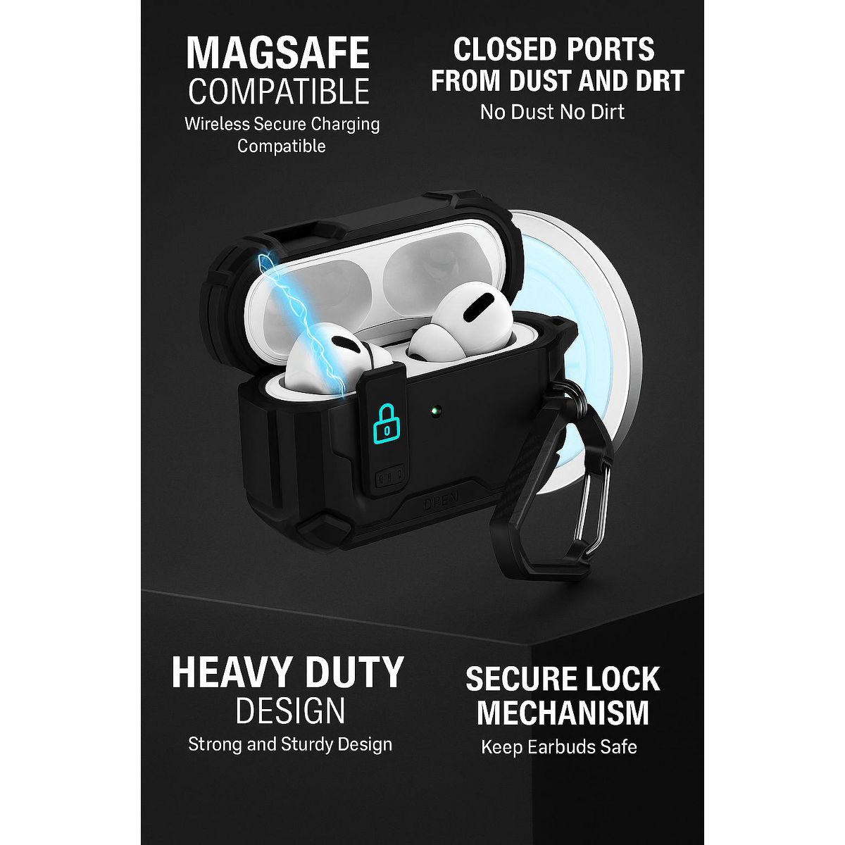 Safeguard your Apple AirPods Pro (3rd Gen) with the SaharaCase Raider Series Heavy Duty Case. Built from rugged TPU, this slim yet durable case defends against scratches, dirt, and everyday wear. Reinforced, shock-absorbing corners help protect against accidental drops, while integrated magnets ensure seamless MagSafe charging. A heavy-duty carabiner clip provides secure attachment to your bag or belt, and a locking mechanism keeps your AirPods safe and in place at all times.