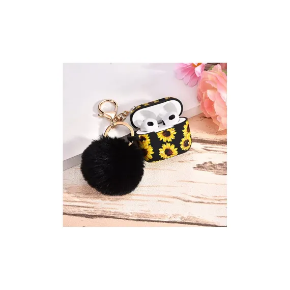 Worryfree Gadgets Case Compatible with Apple Airpods 3 Generation 3rd Cases Silicone Earbuds Case Cover for Women Girls Wireless Charging Sunflower Case with Black Pom Pom Keychain, Sunflower