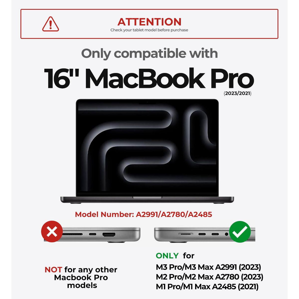 【Please verify your device model first】This durable, heavy-duty protective case is exclusively designed for the 16-inch MacBook Pro with M1, M2, or M3 Pro/Max chips, specifically models A2485 (2021), A2780, and A2991 (2023). Its precisely engineered cutouts offer effortless access to all ports, buttons, and functions, ensuring both complete protection and seamless usability.