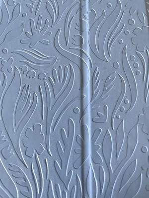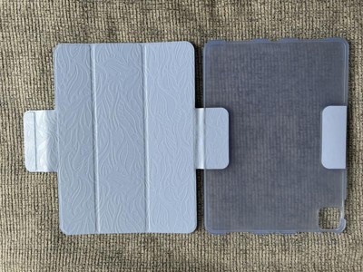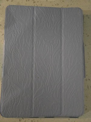 This is a nice travel case for your iPad with a blue, soft texture with an embossed floral pattern and foldable side and a transparent rubbery side. Fits latest IPad perfectly and though soft is durable and reliable.