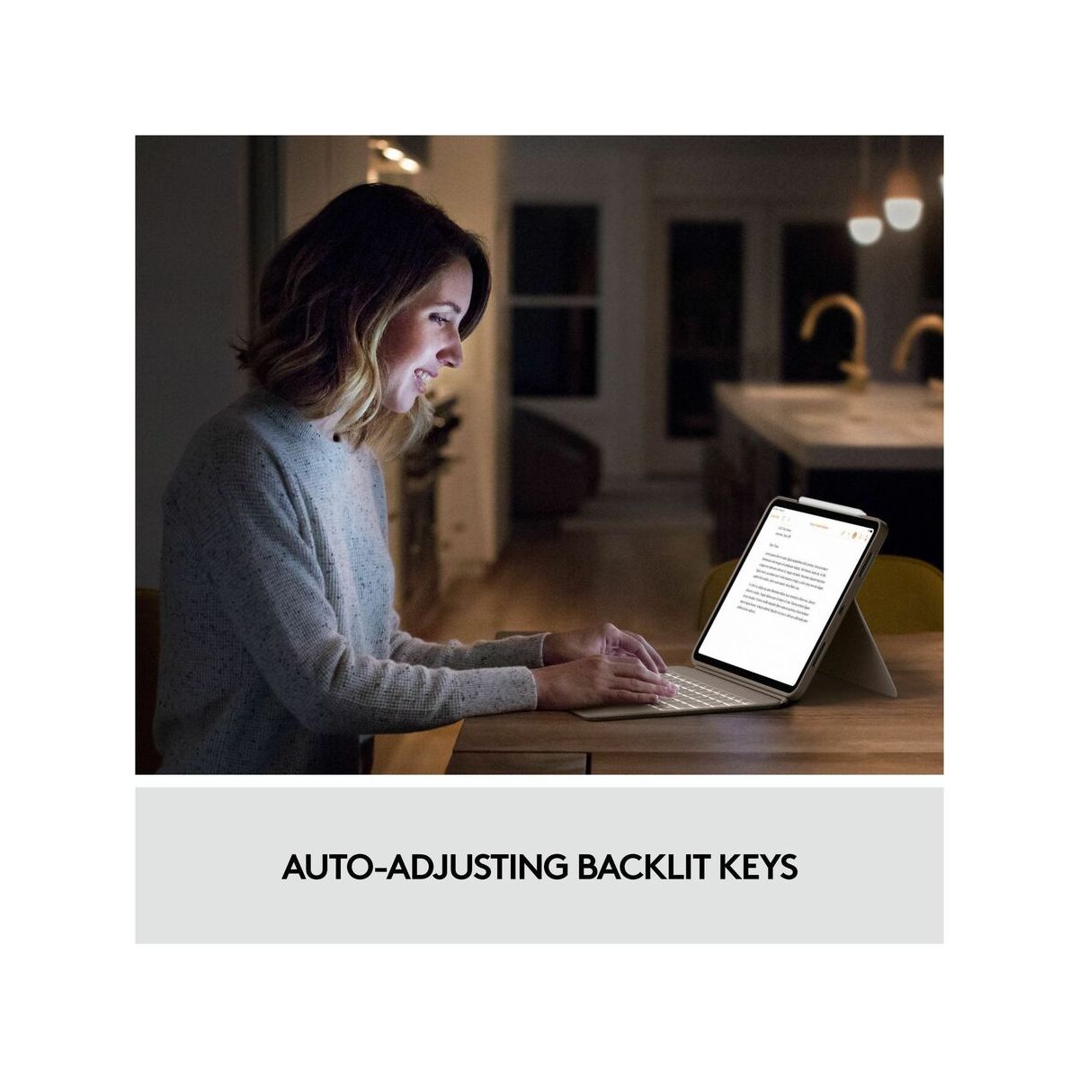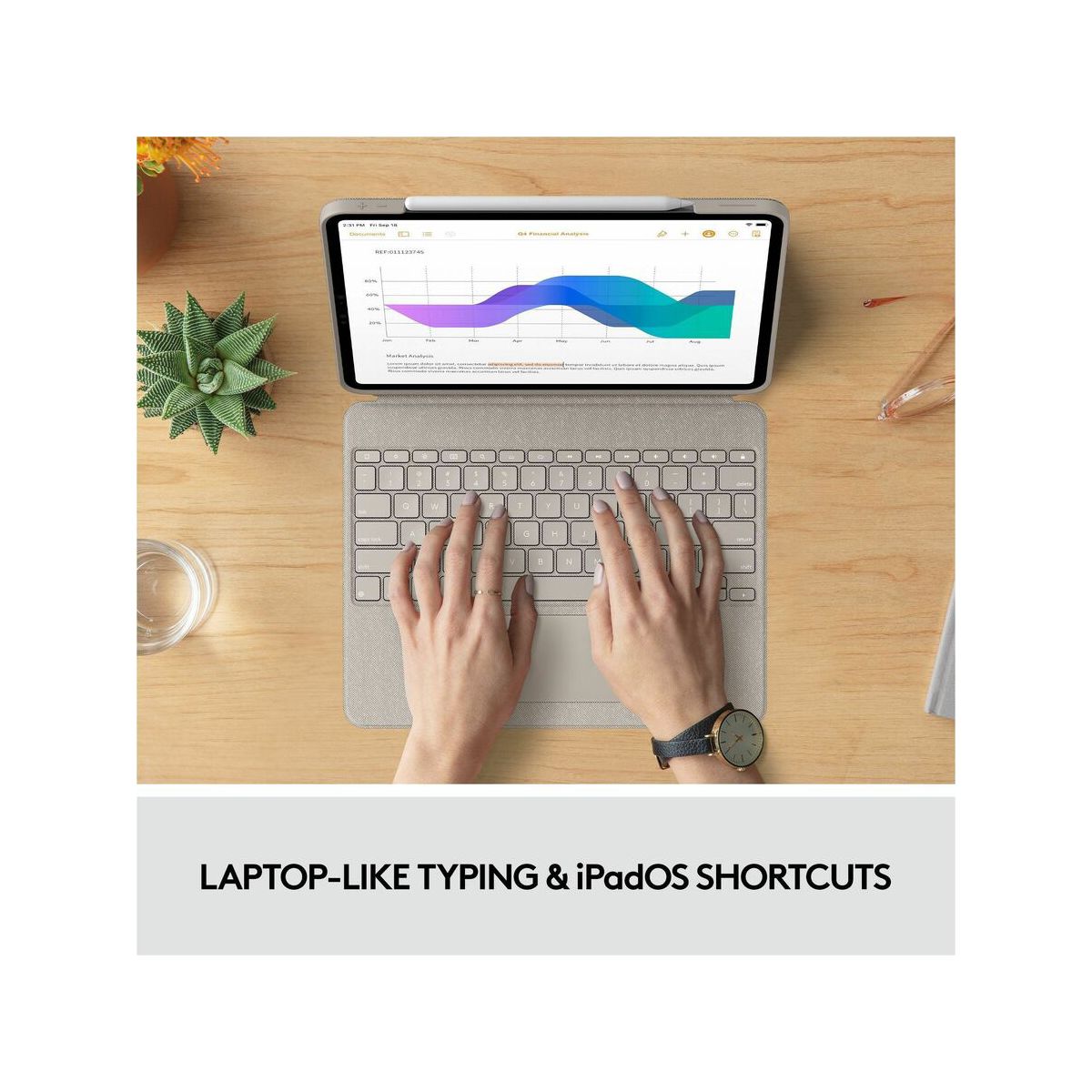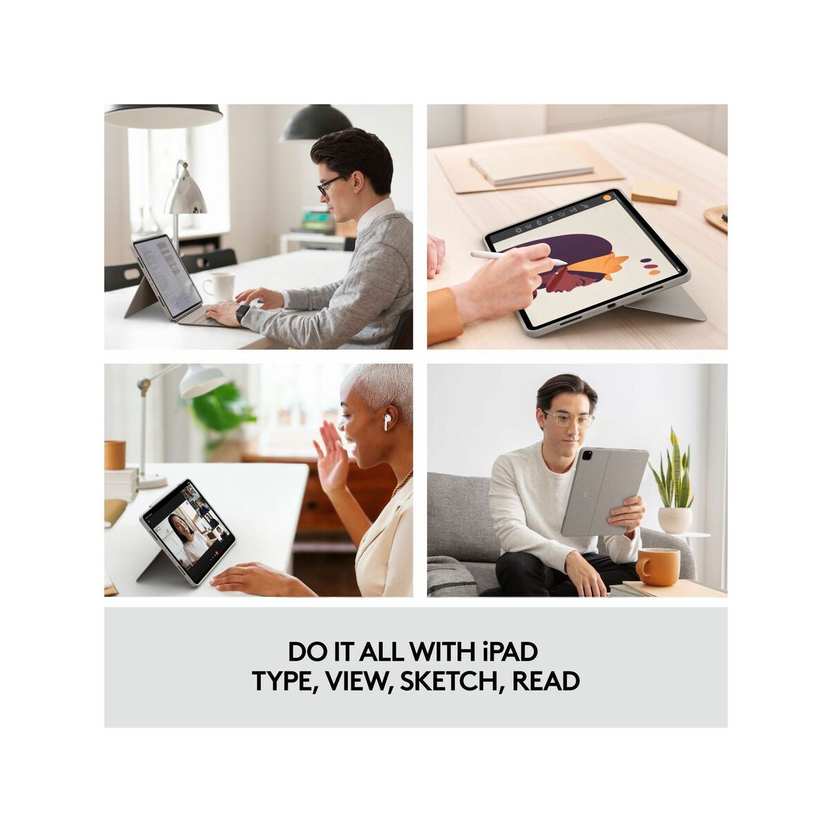 THIS IS NOT A LAPTOP. IT'S SO MUCH MORE. Meet the keyboard case that enables whole new levels of versatility. Type, view, sketch, and read with iPad Pro - all while keeping the front, back, and corners snug and protected. With the new click-anywhere trackpad, together with Logitech's signature laptop-like keyboard, you can work and create effortlessly. Possibilities? Endless. FOUR USE MODES Combo Touch has four use modes to help you accomplish any task. Type Mode: Dock the keyboard upright, pull out the kickstand, and you're ready to type out notes, emails, and more. View Mode: Detach the keyboard and pull out the kickstand to watch movies and videos. Sketch Mode: Fully extend the kickstand for the perfect angle to take handwritten notes and draw with Apple Pencil or Logitech Crayon. Read Mode: Detach the keyboard-or reattach it with the keys turned inward-to read books, articles, and more. DITCH THE KEYBOARD Done typing? Just detach the keyboard so you can sketch, read or watch videos without anything between you and your beautiful iPad screen. Then use the adjustable kickstand's 50 degrees of tilt to find that perfect viewing angle. SECURE, FORM-FIT PROTECTION It's not just protection. It's peace of mind. Combo Touch is molded to perfectly fit your iPad, protecting the front, back, and corners from scrapes and bumps. Rest assured your iPad is secure and won't slip out of the case, so you can focus on what matters-getting things done. Even if you have to go from desk to living room or take it on the go. PREMIUM TRACKPAD EXPERIENCE CLICK ANYWHEREThe new click-anywhere trackpad gives you more freedom, more control, and more precision to tackle the tasks you perform every day in apps such as Safari, Keynote, and Pages. OUR LARGEST TRACKPAD EVERMeet the largest trackpad we've ever designed for a keyboard case. A larger trackpad means more space to work, using all the Multi-Touch trackpad gestures you already know and love. Swipe, tap, pinch, and scroll your way through work. HIGHLY RESPONSIVE AND RELIABLESuper responsive, world class navigation that you've come to expect using Smart Connector technology - all with no pairing required. TYPE DAY OR NIGHT Backlit keys automatically adjust to your environment with 16 levels of brightness-so you can see your keys and stay focused in any lighting environment. Shortcut keys at the top of the keyboard allow you to manually adjust brightness. TYPES LIKE A LAPTOP Over 20 years of typing innovation goes into every keyboard Logitech makes so your keystrokes are fluid, natural, and accurate. Type comfortably for hours with keys that deliver a perfect tactile bounce every time.