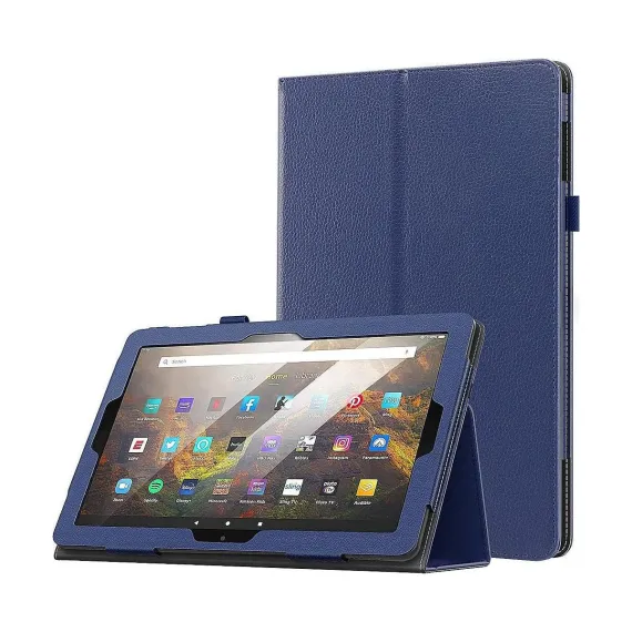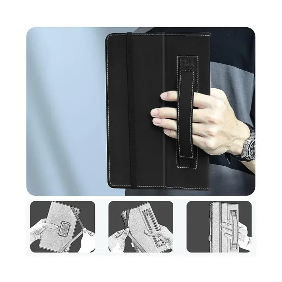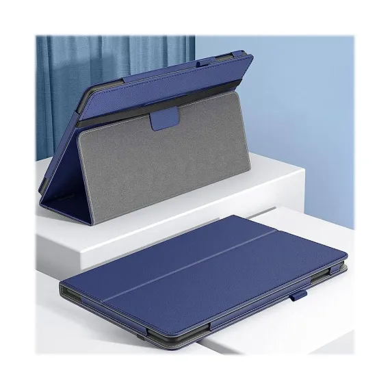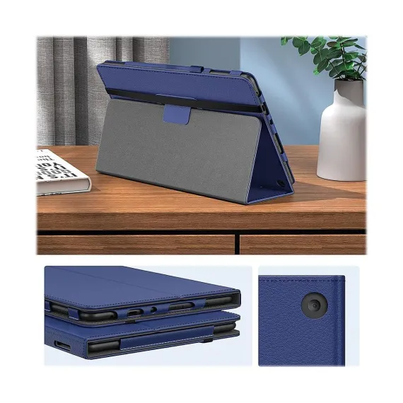 Introducing the SaharaCase bi-fold folio case for the Amazon Fire HD 10 (2023) tablet. This lightweight case offers great protection with raised edges, shielding your screen and camera lens from scratches. Crafted from Vegan leather and TPU, it withstands daily impacts. The ergonomic open button design ensures easy access to ports, while the Vegan leather material resists stretching and yellowing for lasting style. Enjoy hands-free viewing with the foldable kickstand, and a secure hold with the easy grip hand strap. The auto wake/sleep function adds convenience, and with a 1-year warranty, trust in the quality of your purchase. Compatible only with Amazon Fire HD 10 (2023), this case combines functionality and elegance for a stylish tablet experience.