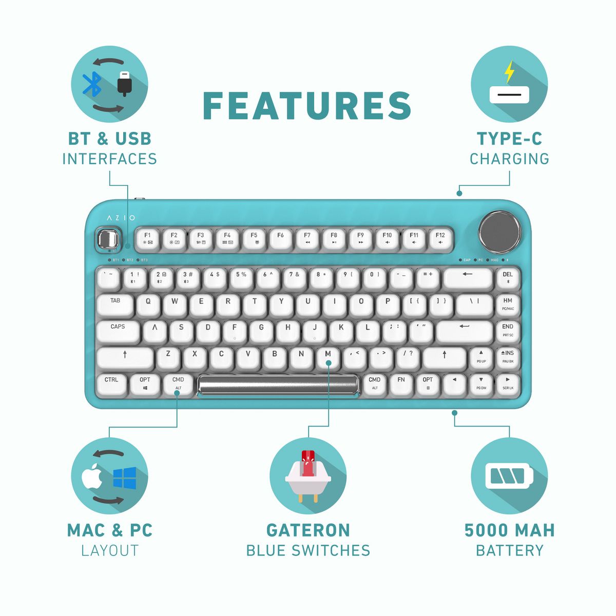 The IZO Mechanical Computer Keyboard from Azio is a vibrant computer accessory aimed to boost your mood through color. By mixing the contemporary color of the body with subtle tones of the keycaps, the lighter-colored backlight creates a balanced tri-color effect. Blended with an alluring metallic and matte paint for a fresh perspective on pearl finishes, the trifecta of colors is complete with a touch of elegant gold on the knob and keycaps. Every corner, line, and edge follows a unified curved form designed to be visually soothing and soft to the touch. The intuitive metallic control knob is both gorgeous and functional - helping you efficiently access important media and backlight functions with ease. The custom PBT double-shot keycaps include laser-etched font so the keys will never fade away with time and usage._