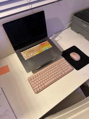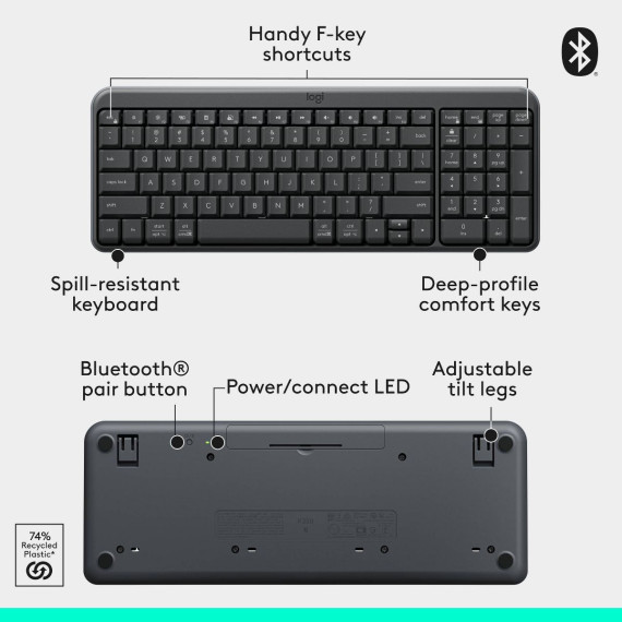 Connect easy and breeze through daily tasks using the Logitech Bluetooth Compact Combo. Connect in seconds without the need for a dongle. The space-saving keyboard design includes a numpad, providing full functionality in a compact form. Enjoy a smooth ambidextrous mouse shape and deep-profile, comfortable keyboard keys in a spill-resistant design. Made to last, the Bluetooth Compact Combo is made by Logitech, a brand known for quality since 1981, and made to last with recycled plastic.* The Bluetooth Compact Combo combines practicality and durability in one compact, full-featured solution.
