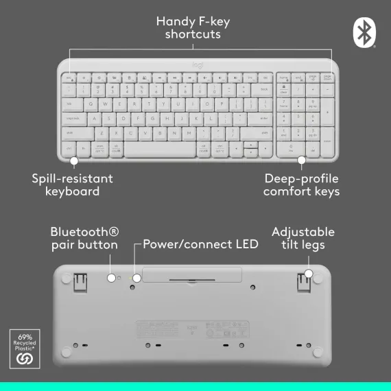 Connect easy and breeze through daily tasks using the Logitech Bluetooth Compact Combo. Connect in seconds without the need for a dongle. The space-saving keyboard design includes a numpad, providing full functionality in a compact form. Enjoy a smooth ambidextrous mouse shape and deep-profile, comfortable keyboard keys in a spill-resistant design. Made to last, the Bluetooth Compact Combo is made by Logitech, a brand known for quality since 1981, and made to last with recycled plastic.* The Bluetooth Compact Combo combines practicality and durability in one compact, full-featured solution.