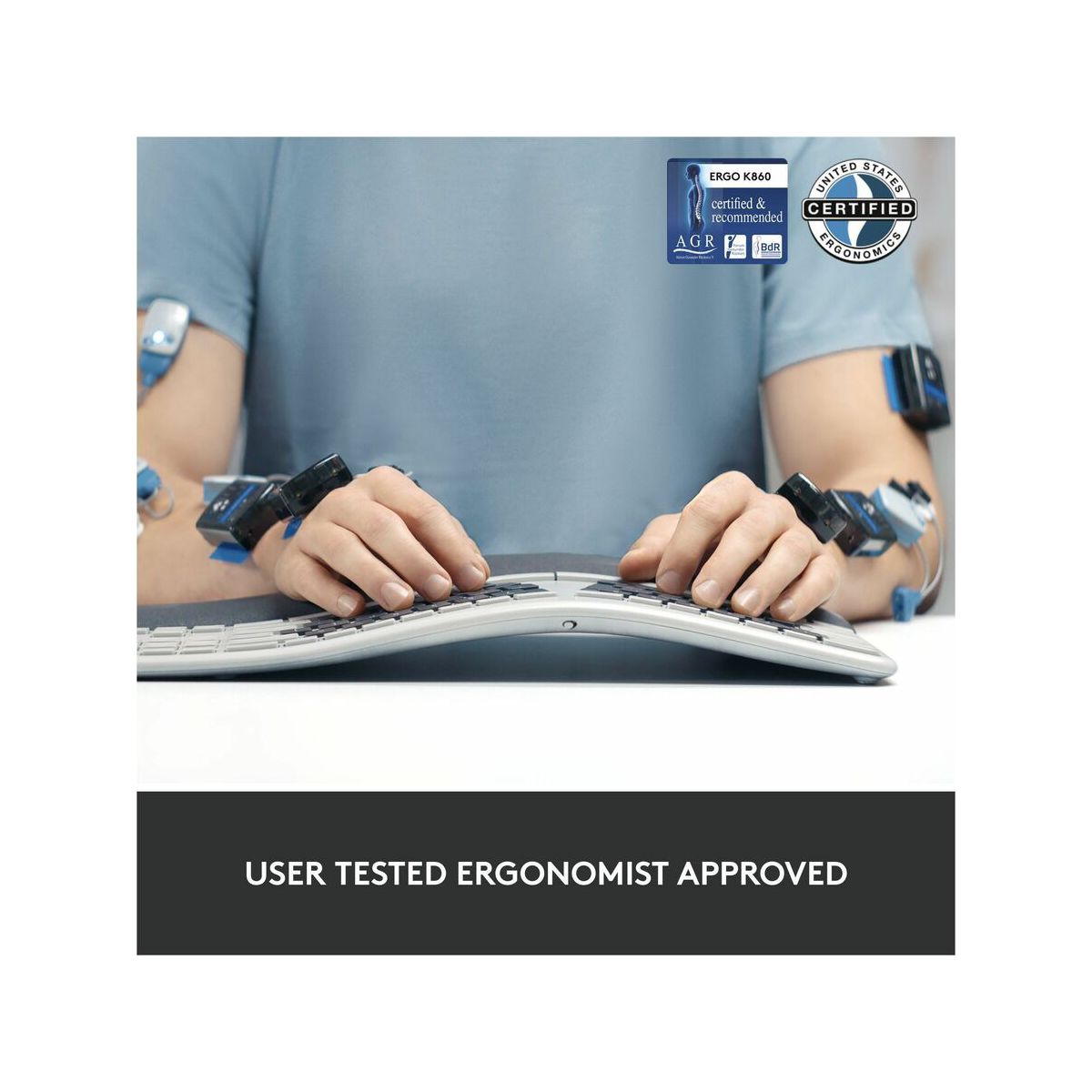 ERGO K860 for Business is a science-driven ergonomic keyboard with a curved, split keyframe and a fluid, ultra-precise typing experience. The included palm rest provides 54%* more wrist support and is proven to reduce muscle activity by 21%* in the upper trapezius muscle. This keyboard is uniquely designed for hours of comfortable typing.