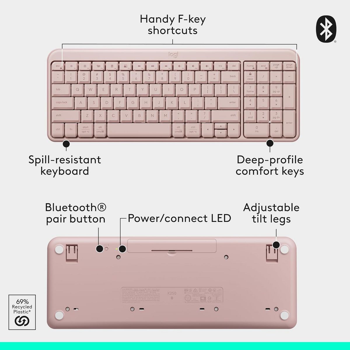 Connect easy and breeze through daily tasks using the Logitech MK250 Bluetooth wireless combo. Connect in seconds without the need for a dongle. The space-saving keyboard design includes a numpad, providing full functionality in a compact form. Enjoy a smooth ambidextrous mouse shape and deep-profile, comfortable keyboard keys in a spill-resistant design. Made to last, MK250 is made by Logitech, a brand known for quality since 1981, and made to last with recycled plastic. MK250 combines practicality and durability in one compact, full-featured solution.