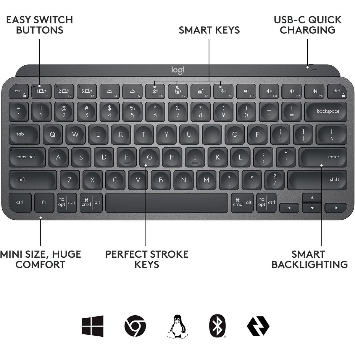 Small yet powerful, MX Keys Mini for Business features a remarkably solid build, high-performance Logi Bolt wireless, productivity-boosting Perfect Stroke typing, smart backlighting and F-keys. With two ways to connect, cross-platform compatibility and 10-day battery life—plus space-saving minimalist design—this keyboard is great for everyday tasks and ambitious creative projects. The device's basic functions will be supported without additional drivers in Chrome OS and most popular Linux distributions. Requires Logitech Options software, available for Windows and macOS. Battery life may vary based on user and computing conditions.