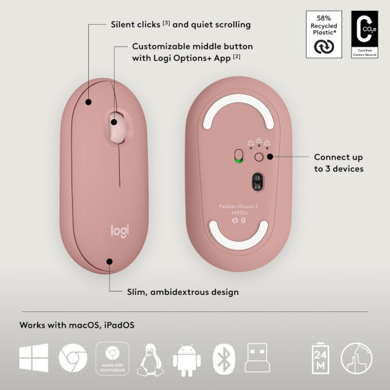 Made with recycled plastic, Pebble 2 Combo's minimalist, slim design makes it as iconic as you and super portable. Pair up to 3 wireless devices across OS and switch between devices with a press of a button. With Logi Options+ app, you can customize your Pebble Mouse 2 M350s' middle button with shortcuts that shuffle your Spotify playlist, send emojis on WhatsApp, and more.