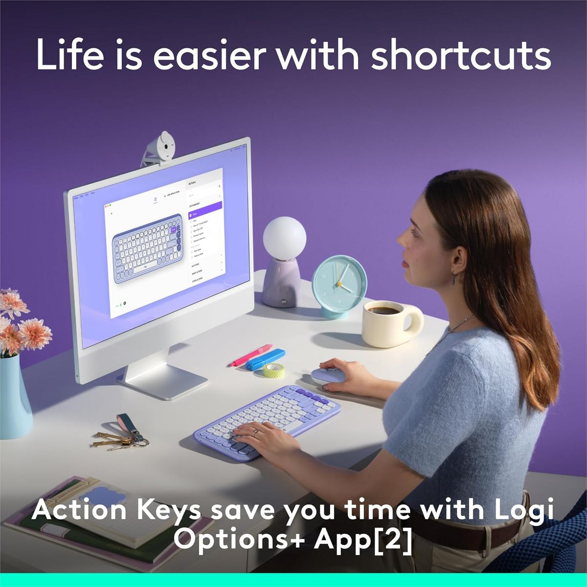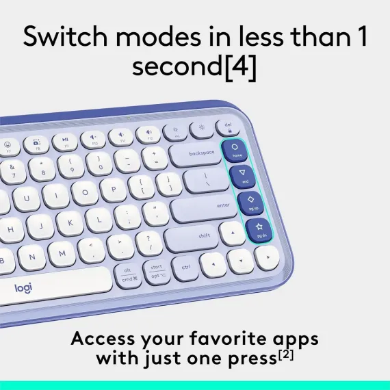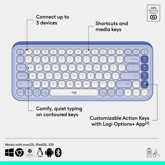 Add an extra pop to your desk with the POP Icon Keys wireless keyboard, a compact Bluetooth keyboard with a bold aesthetic, comfy typing, and customizable Action Keys. Get comfortable with the contoured, low-profile keys for comfy, quiet, laptop-like typing. Make your life easier with the customizable Action Keys and Logi Options+ App where you can switch between work and break mode effortlessly – and in under a second. You can also easily switch between up to 3 wireless devices across different operating systems (Windows, macOS, iPadOS, iOS, ChromeOS, Android) with a press of the Easy-Switch buttons.