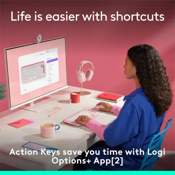Add an extra pop to your desk with the POP Icon Keys wireless keyboard, a compact Bluetooth keyboard with a bold aesthetic, comfy typing, and customizable Action Keys. Get comfortable with the contoured, low-profile keys for comfy, quiet, laptop-like typing. Make your life easier with the customizable Action Keys and Logi Options+ App where you can switch between work and break mode effortlessly – and in under a second. You can also easily switch between up to 3 wireless devices across different operating systems (Windows, macOS, iPadOS, iOS, ChromeOS, Android) with a press of the Easy-Switch buttons.