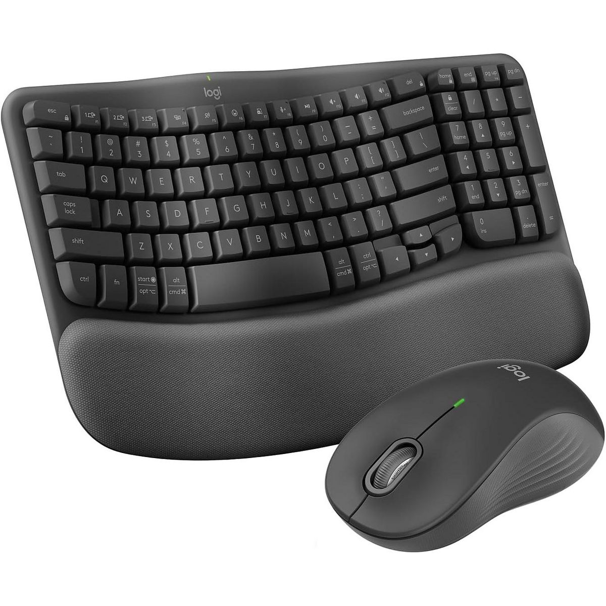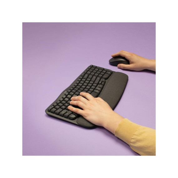 Experience day-long comfort and productivity with this wireless ergonomic keyboard and mouse combo. Typing feels instantly familiar on Wave Keys’ wavy keyframe design. The cushioned keyboard palm rest lifts pressure and improves wrist support. The Signature M550 L Wireless Mouse features a contoured shape and rubber side grip to keep medium- to large-sized hands comfortable throughout the day.