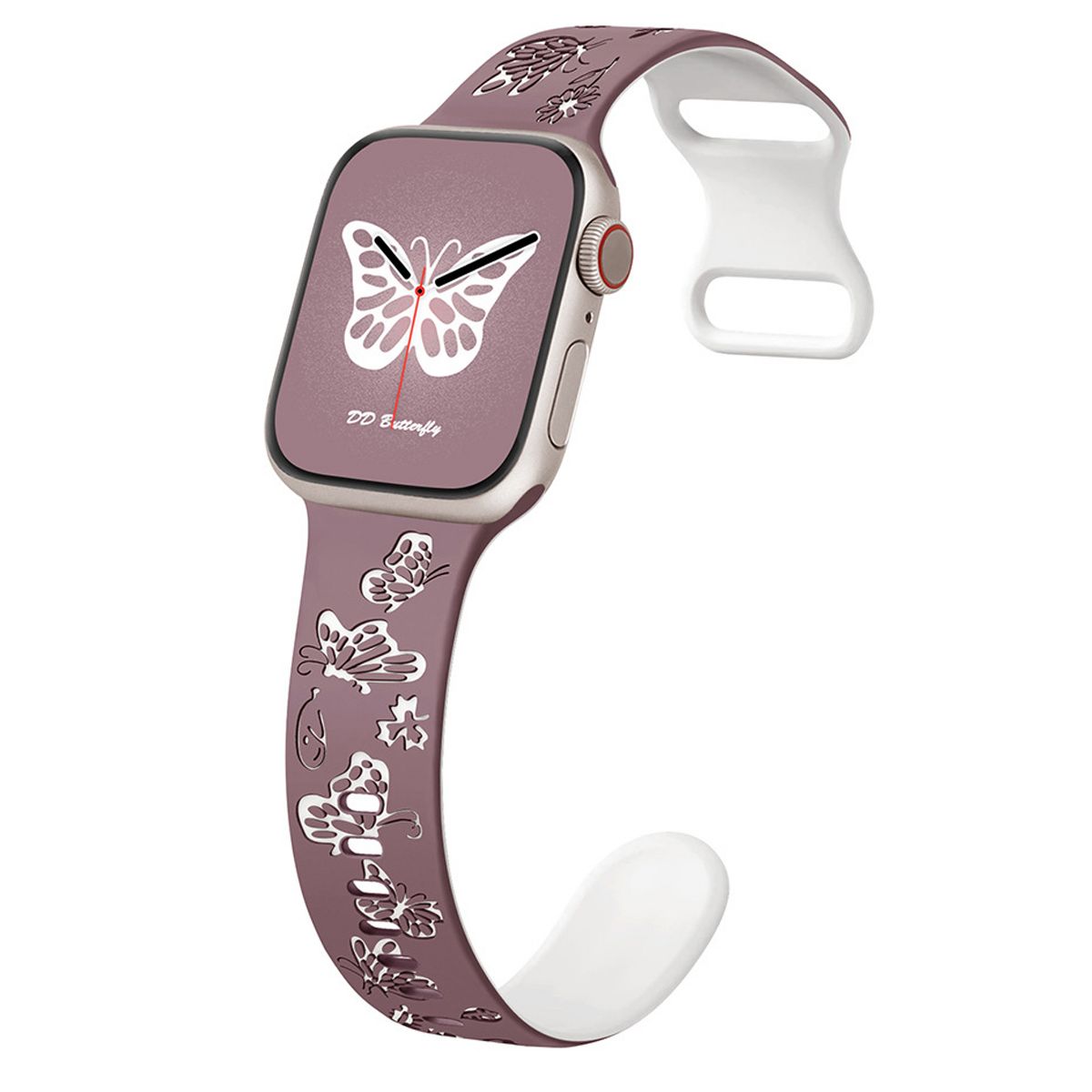 This Butterfly Engraved Apple Watch Band merges whimsical elegance with sporty functionality, featuring intricate butterfly engravings, a eye-catching two-tone silicone design, and a lightweight, flexible structure—tailored exclusively for Apple Watch models, including iWatch Series 10, 9, 8, 7, 6, 5, 4, 3, 2, 1, SE, and Ultra. Designed to elevate smartwatch customization, the strap stands out with its detailed butterfly engravings: precision-carved into the silicone surface, these motifs add subtle texture and a playful, nature-inspired charm, while the two-tone color scheme creates visual depth—avoiding monotony and making the band a statement accessory that complements diverse personal styles.