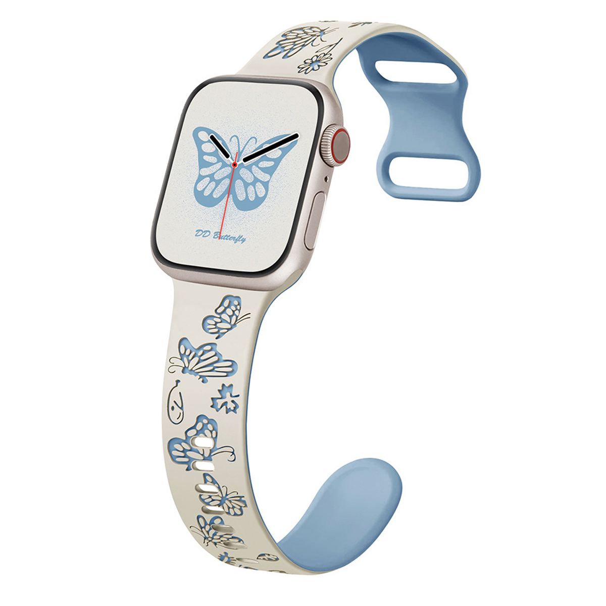 This Butterfly Engraved Apple Watch Band merges whimsical elegance with sporty functionality, featuring intricate butterfly engravings, a eye-catching two-tone silicone design, and a lightweight, flexible structure—tailored exclusively for Apple Watch models, including iWatch Series 10, 9, 8, 7, 6, 5, 4, 3, 2, 1, SE, and Ultra. Designed to elevate smartwatch customization, the strap stands out with its detailed butterfly engravings: precision-carved into the silicone surface, these motifs add subtle texture and a playful, nature-inspired charm, while the two-tone color scheme creates visual depth—avoiding monotony and making the band a statement accessory that complements diverse personal styles.