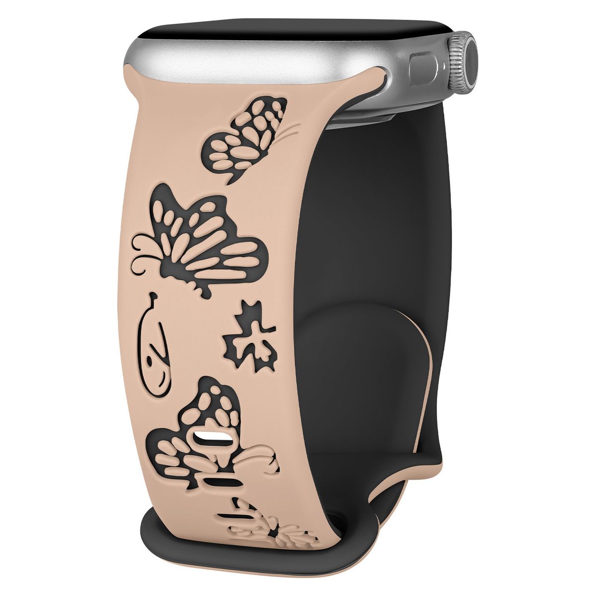 This engraved band for apple watch band features the butterfly engraved two-toned design with two layers of different colors perfect blend. Looks pretty on your wrist. The engraved butterfly design adds a unique and artistic flair to your wrist, making it a perfect accessory for your Apple Watch.