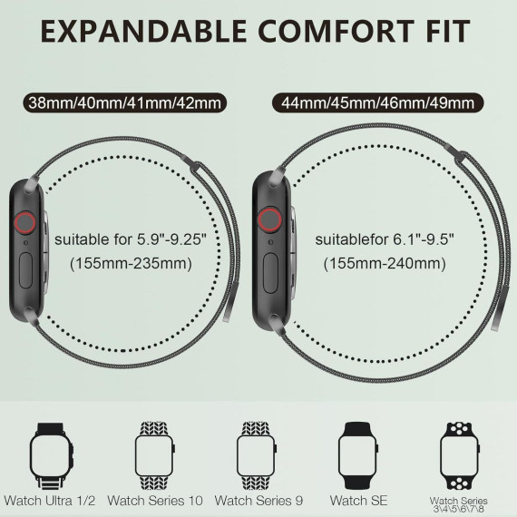 This replacement band, compatible with all Apple Watch Series models, is designed to cater to both women and men, merging style with practicality. Crafted from premium stainless steel, the mesh loop boasts a sleek, interconnected design that offers a comfortable, breathable fit—ideal for all-day wear, whether you’re at work, exercising, or out and about. The magnetic clasp is a standout feature, allowing for effortless adjustment to your wrist size without the need for tools; simply align the magnets for a secure, customized fit. With its versatile aesthetic, this band transitions seamlessly from casual daily activities to more formal occasions, making it a versatile addition to any smartwatch owner’s accessory collection.