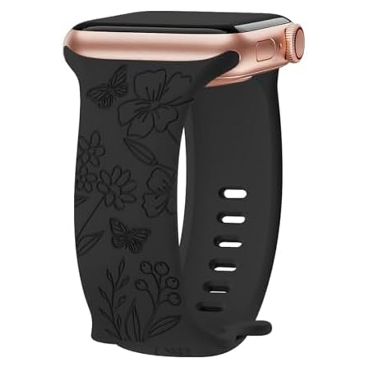 HTUTWOO Engraved Butterfly Apple Watch Band, Soft Silicone Strap 38/40/41mm, for iWatch Series 10 9 8 7 6 5 4 3 2 1 SE Ultra - Black