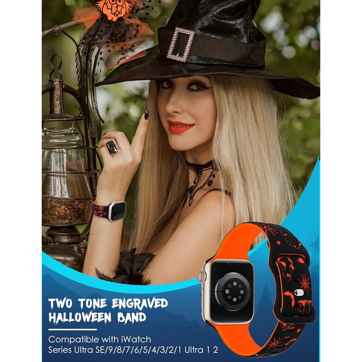 HTUTWOO Halloween Engraved Band Compatible with Apple Watch Band 38/40/41mm for Women Men, Two-Tone Strap for iWatch Series Ultra SE, Black+Orange