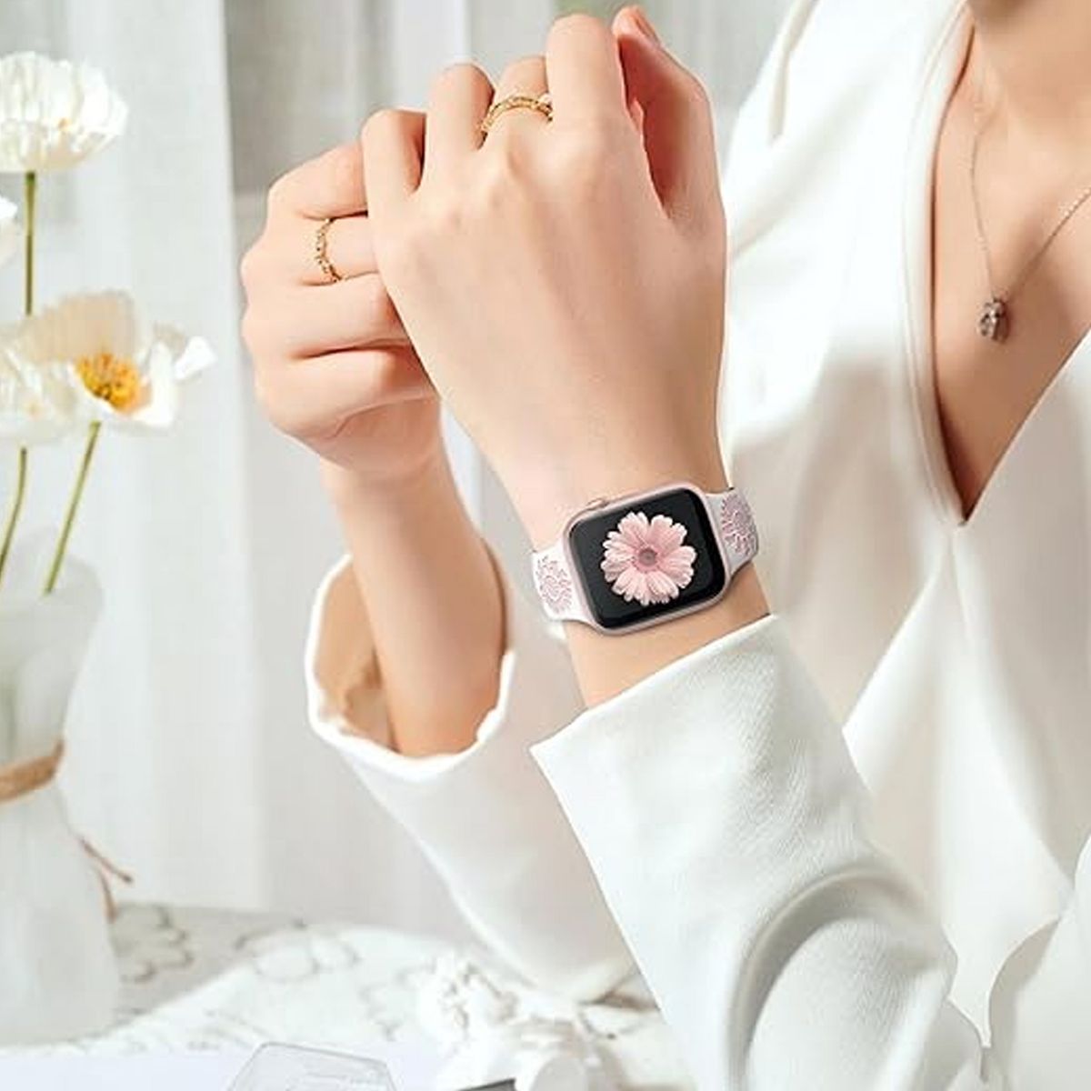 HTUTWOO Sunflowers Engraved Apple Watch Band, Soft Silicone Sport Strap 38/40/41mm for iWatch Series 11 10 9 8 7 6 5 4 3 2 1 SE Ultra (White+Pink)