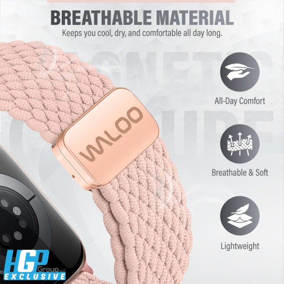 The Waloo Braided Nylon Magnetic Apple Watch Replacement Band combines premium craftsmanship with everyday functionality. Its soft, breathable weave feels gentle against the skin, while the adjustable magnetic closure ensures a secure, customized fit. Lightweight yet durable, this band is perfect for workouts, office wear, and casual outings, making it a versatile choice for any occasion. Compatible with all Apple Watch models. Please review the size chart to ensure you select the proper size based on your Apple Watch series and case size. This listing is for the replacement band only - Apple Watch not included. Waloo bands are designed specifically for use with Apple Watch, but this product is not licensed, sponsored, endorsed, or manufactured by Apple, Inc.