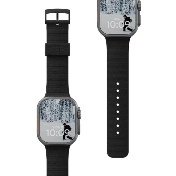 The UAG Dot watch strap is made of soft-touch silicone, designed for all-day comfort and effortless style. It features a subtle micro-dot pattern for a unique tactile look, and the safety loop includes a debossed UAG logo for an exclusive touch. The strap is equipped with premium stainless steel hardware in a matte gunmetal finish, providing durability and reliability. It ensures a secure fit, making it suitable for any occasion, from workouts to workdays.