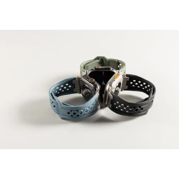 Forge your path with the Monarch Apple Watch Strap—the ultimate fusion of rugged strength and premium craftsmanship. Designed for those who demand durability without sacrificing style, this strap is built to withstand the elements while enhancing your look. Constructed from premium FKM fluoroelastomer, the Monarch delivers superior performance in any environment. The strap resists extreme temperatures, chemicals, UV rays, water, and dust, making it the perfect companion for outdoor adventures. The custom titanium-colored stainless steel hardware adds a touch of sophistication while ensuring durability you can count on. Its tuck-and-pin closure system keeps your strap secure and sleek, preventing snags and keeping the excess strap neatly out of the way for all-day comfort. The perforated design improves airflow, helping you stay cool, while bold accent colors add a modern edge. Rugged. Refined. Monarch.