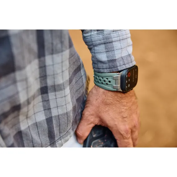 Forge your path with the Monarch Apple Watch Strap—the ultimate fusion of rugged strength and premium craftsmanship. Designed for those who demand durability without sacrificing style, this strap is built to withstand the elements while enhancing your look. Constructed from premium FKM fluoroelastomer, the Monarch delivers superior performance in any environment. The strap resists extreme temperatures, chemicals, UV rays, water, and dust, making it the perfect companion for outdoor adventures. The custom titanium-colored stainless steel hardware adds a touch of sophistication while ensuring durability you can count on. Its tuck-and-pin closure system keeps your strap secure and sleek, preventing snags and keeping the excess strap neatly out of the way for all-day comfort. The perforated design improves airflow, helping you stay cool, while bold accent colors add a modern edge. Rugged. Refined. Monarch.