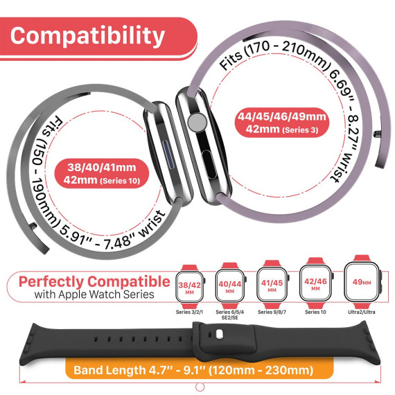 Vena’s silicone watch bands are compatible with Apple Watch 38mm, 40mm, 41mm; Series 9/8/7/6/5/4/3/2/1, SE 2nd gen/1st gen and 42mm Series 10.