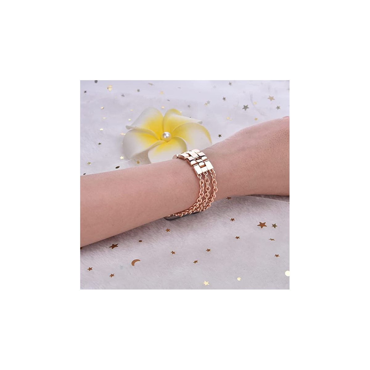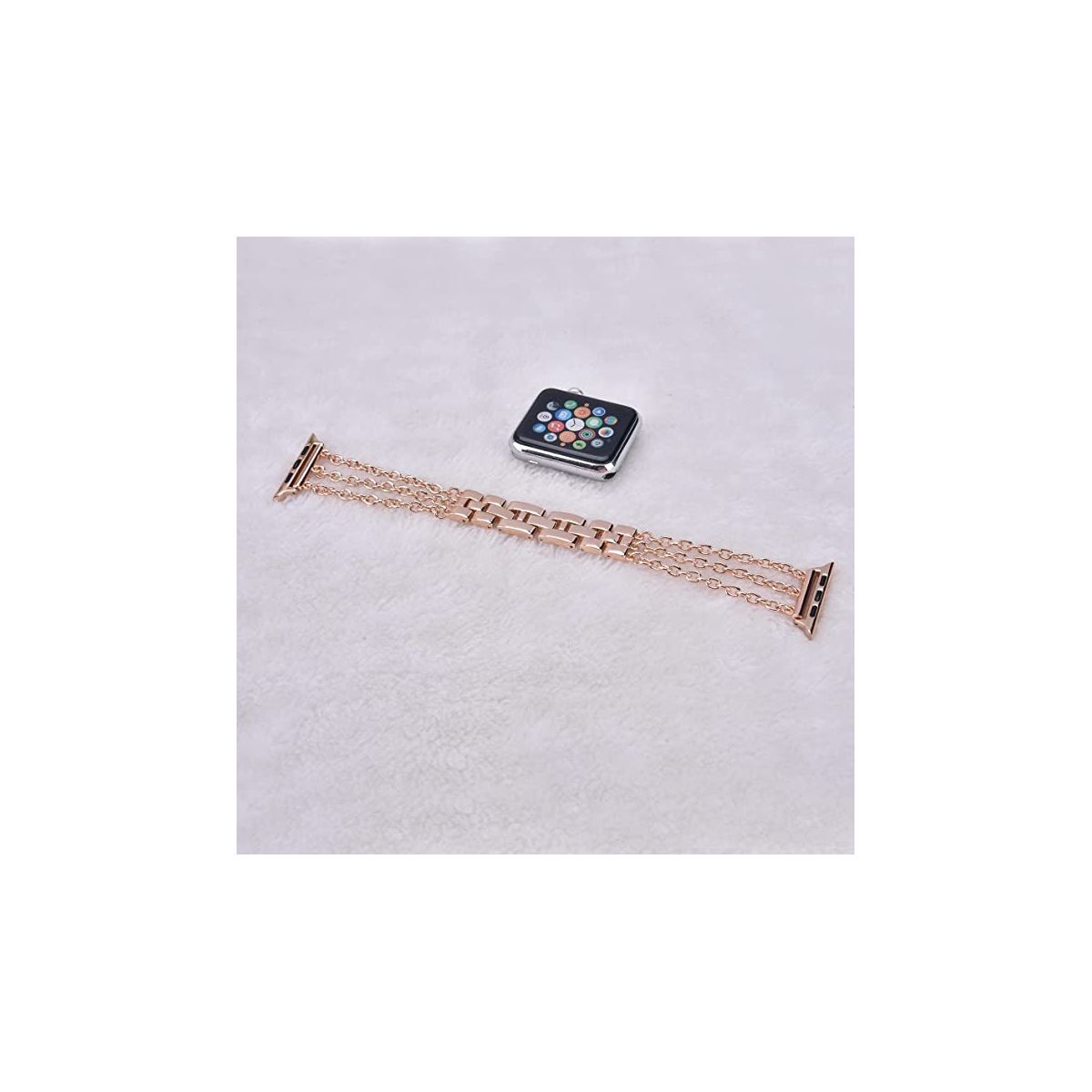 Worryfree Gadgets Alloy Metal Fashion Dressy Chain Band Compatible with Apple Watch Band Color: Rose Gold. Alloy metal iWatch Strap Compatible iWatch Size: 38mm 40mm 41mm and 42mm 44mm 45mm 49mm Compatible iWatch Series: Series 8, Series 7, Series 6, Series 5, Series 4, Series 3, Series 2, Series 1 and Series SE Length 183mm, can be adjusted shorter Beautiful Design and Elegant Dressy band for any occasion. Perfect gift for Her 1. Perfect design: 3 chains dressing up your iWatch like a luxurious Jewelry, Bring you the ultimate elegance. Perfect matching any occasion, such as wedding, shopping and party. 2. Easy to be adjusted length, just take out link to adjust size.