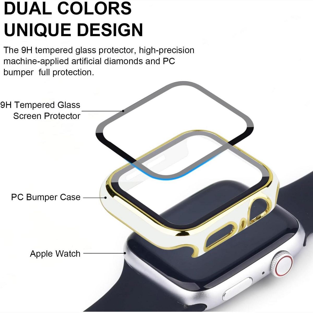 Worryfree Gadgets Bumper Case with Screen Protector for Apple Watch 45mm, Black/Gold - 45MM