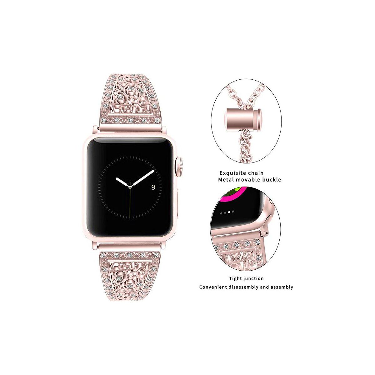 "Bling Alloy Metal Bands Compatible with Apple Watch Band 38mm 40mm 41mm and 42mm 44mm 45mm 49mm iWatch Series 8/7/6/5/4/3/2/1 and SE. Dressy Jewelry Diamond Cuff Bracelet Bangle Wristband for Women Girls, Easy to adjust Apple Watch Size: 38mm/40mm/41mm and 42mm/44mm/45mm Compatible with Apple Watch Series: Series 8, 7, 6, 5, 4, 3, 2, 1 & SE High quality alloy metal, well polished, dressy Apple Watch band made of premium alloy metal and wrapped in high-quality rhinestones, the inlaid diamond is firm and reliable, not easy to fall off, each small diamond shines with dazzling light, making people unable to take their eyes off. Unique design makes it a sleek and robust daily companion.