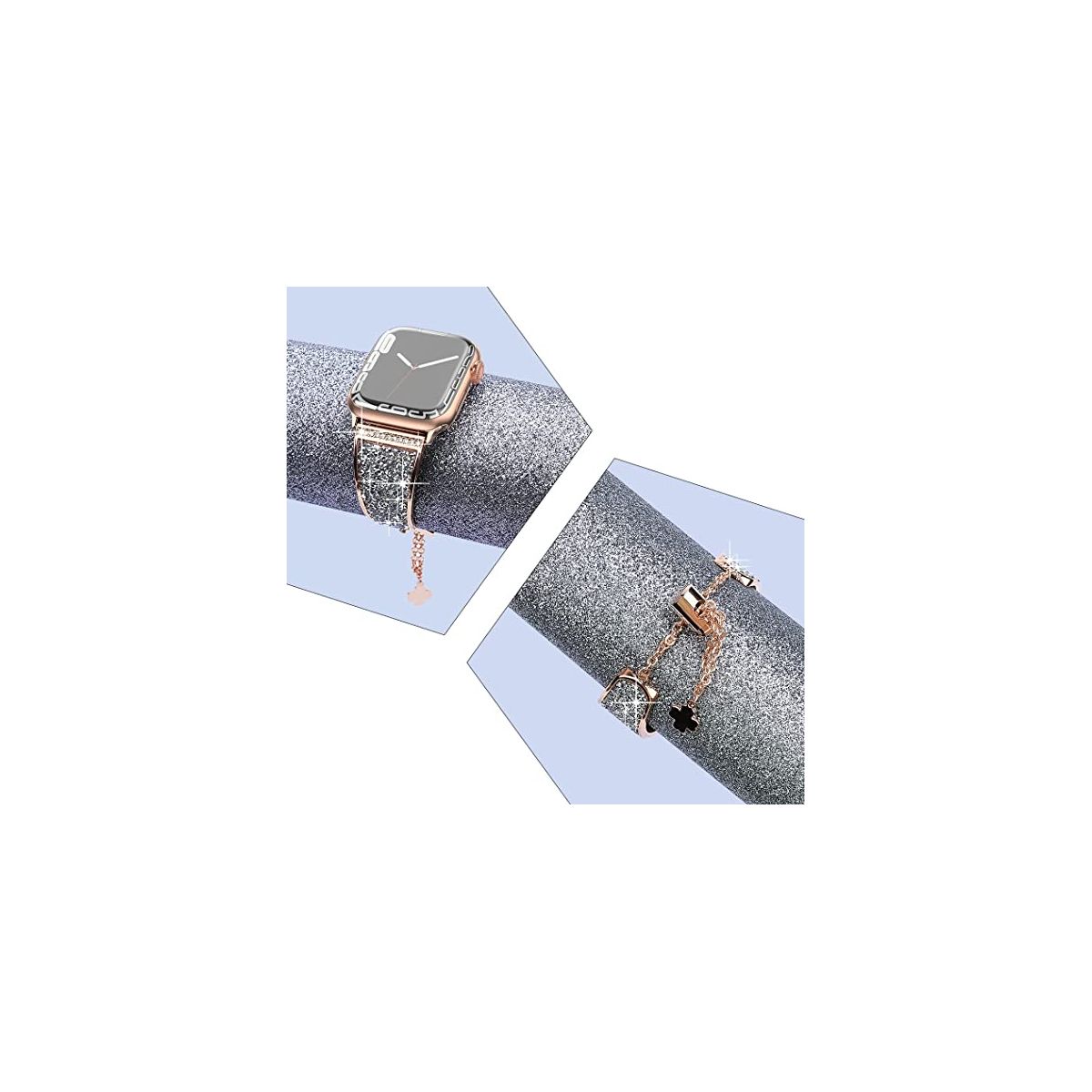 "Crystals never comes off- With advanced adhesive process, the crystals are permanently glued on the band and will never come off. Made of premium stainless steel with fine polish, unique color, beautiful and luxurious, smooth, breathable, and comfortable to wear. No sharp edges at all. Give yourself a gift with the Worryfree Gadget metal blink apple watch band.