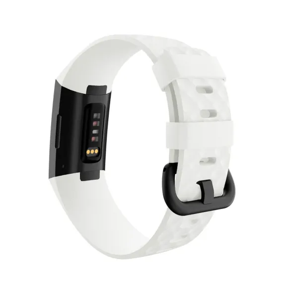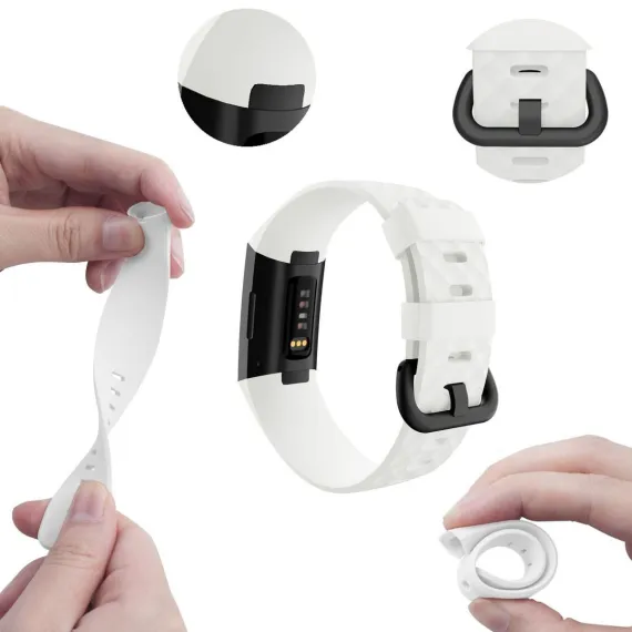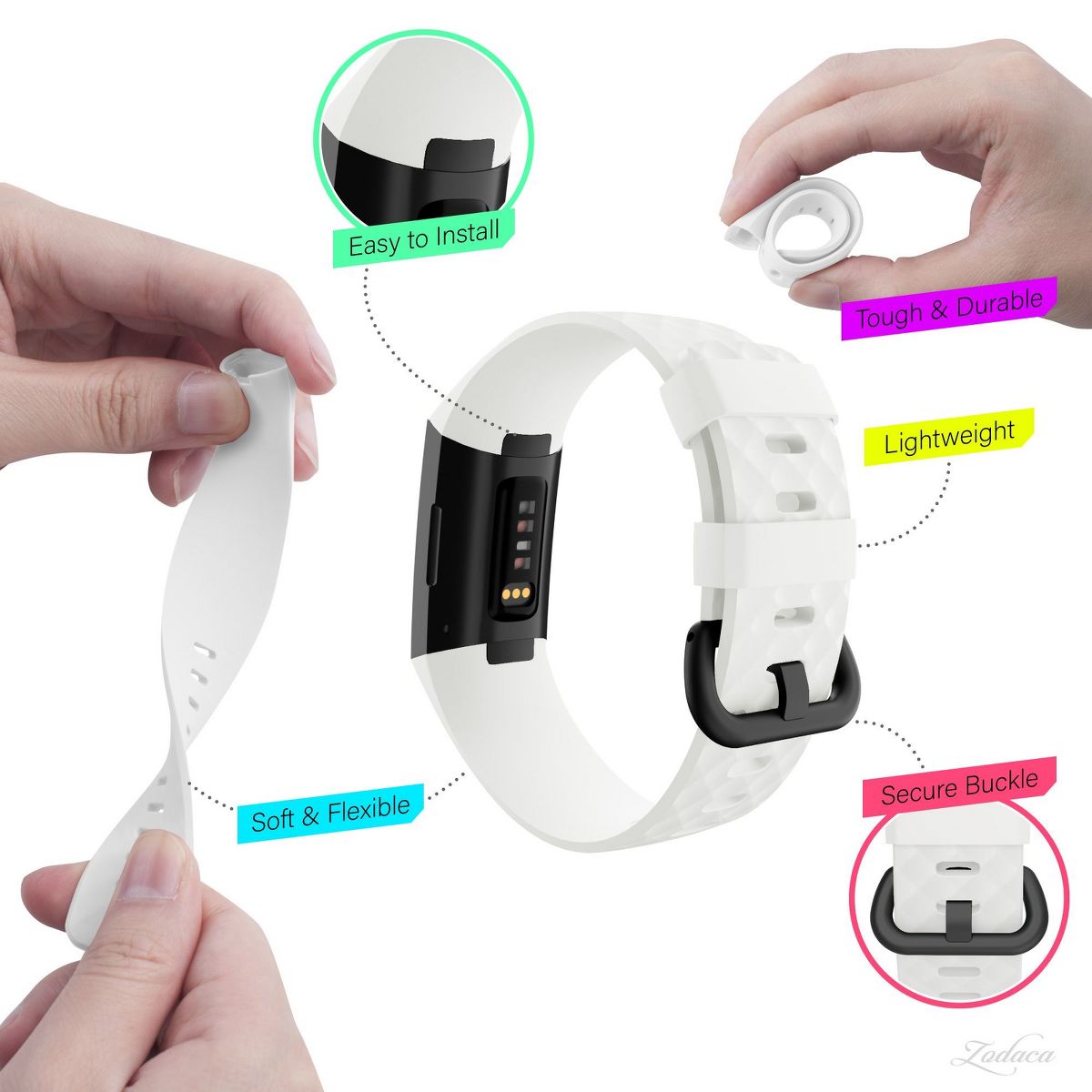 Upgrade the look of your Fitbit Charge 3, Fitbit Charge 3 SE (Small), or Fitbit Charge 4 Fitness Tracker using this fitness tracker watch band replacement from Insten. Made of durable silicone and polycarbonate plastic, it is resistant to sweat and water, making it great for use at the beach or swimming pool. Installation is easy. Simply remove the old watch band from your Fitbit fitness tracker, then install this white watch band replacement. Designed to fit smaller wrists, it can be adjusted to fit wrists ranging from 5.5 to 7.1 inches in circumference. To measure your wrist size, wrap a piece of string around it, then measure the string from the end to the point where it crosses over the end using a ruler or tape measure. These fitness tracker replacement bands are white with a black buckle. Please note that the Fitbit fitness trackers pictured in the images are NOT INCLUDED.